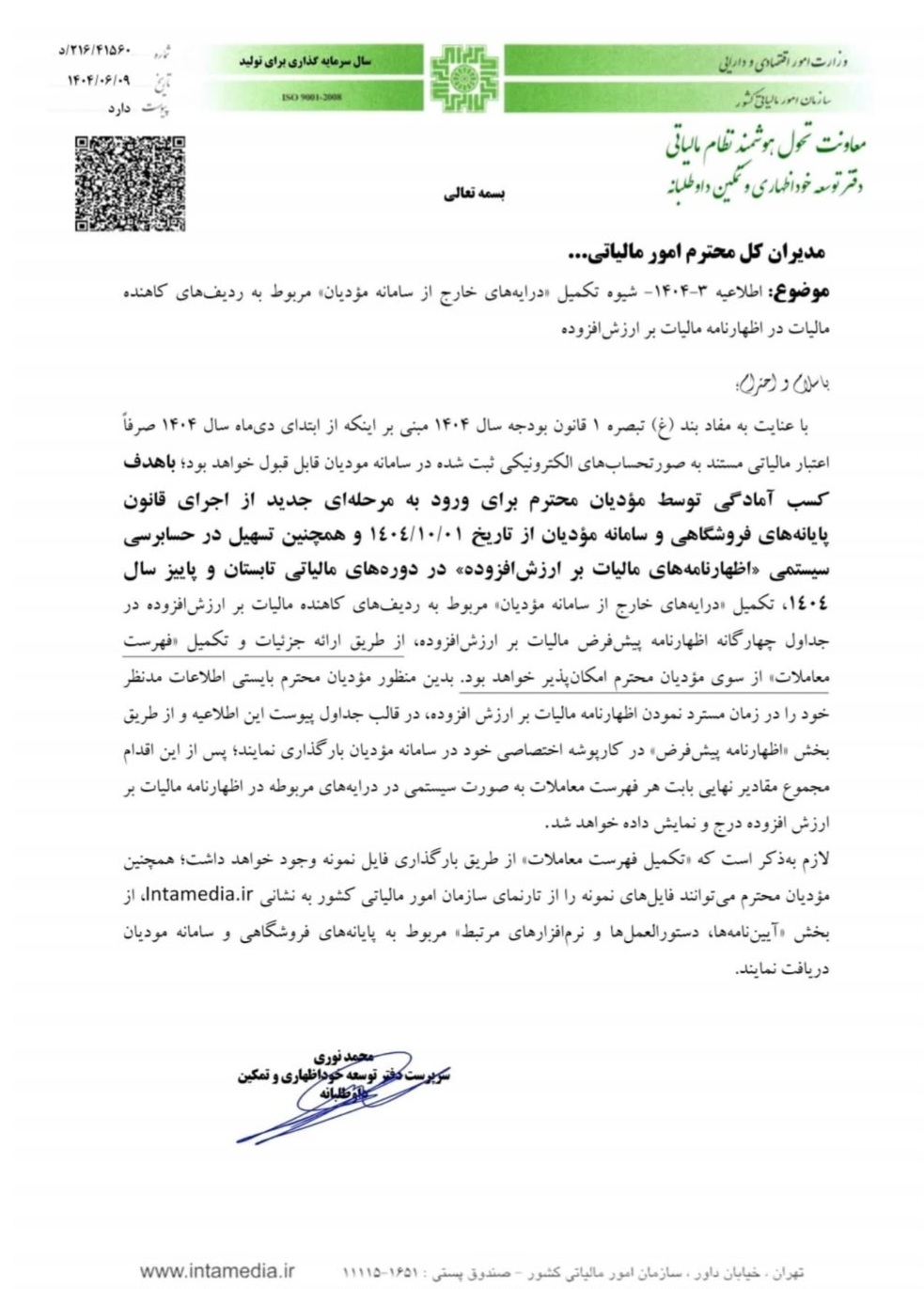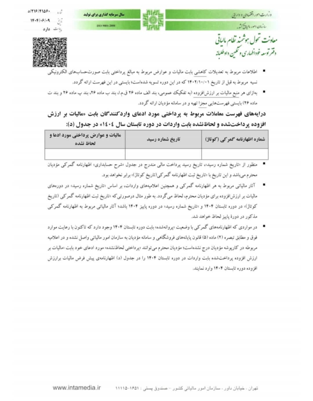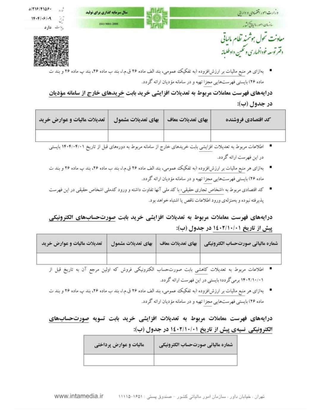 اطلاعیه 3-1404- تکمیل درایههای خارج از سامانه مودیان (ثبت اطلاعات خارج از سامانه مودیان) در جداول اظهارنامه های ارزش افزوده تابستان و پاییز 1404 ، به صورت دستی نخواهد بود و به صورت بارگذاری فایل خواهد بود. برای دانلود فایلهای نمونه از لینک زیر اقدام نمایید و از هماکنون، این فایلها را برای اظهارنامههای ارزش افزوده تابستان و پاییز آماده نمایید: