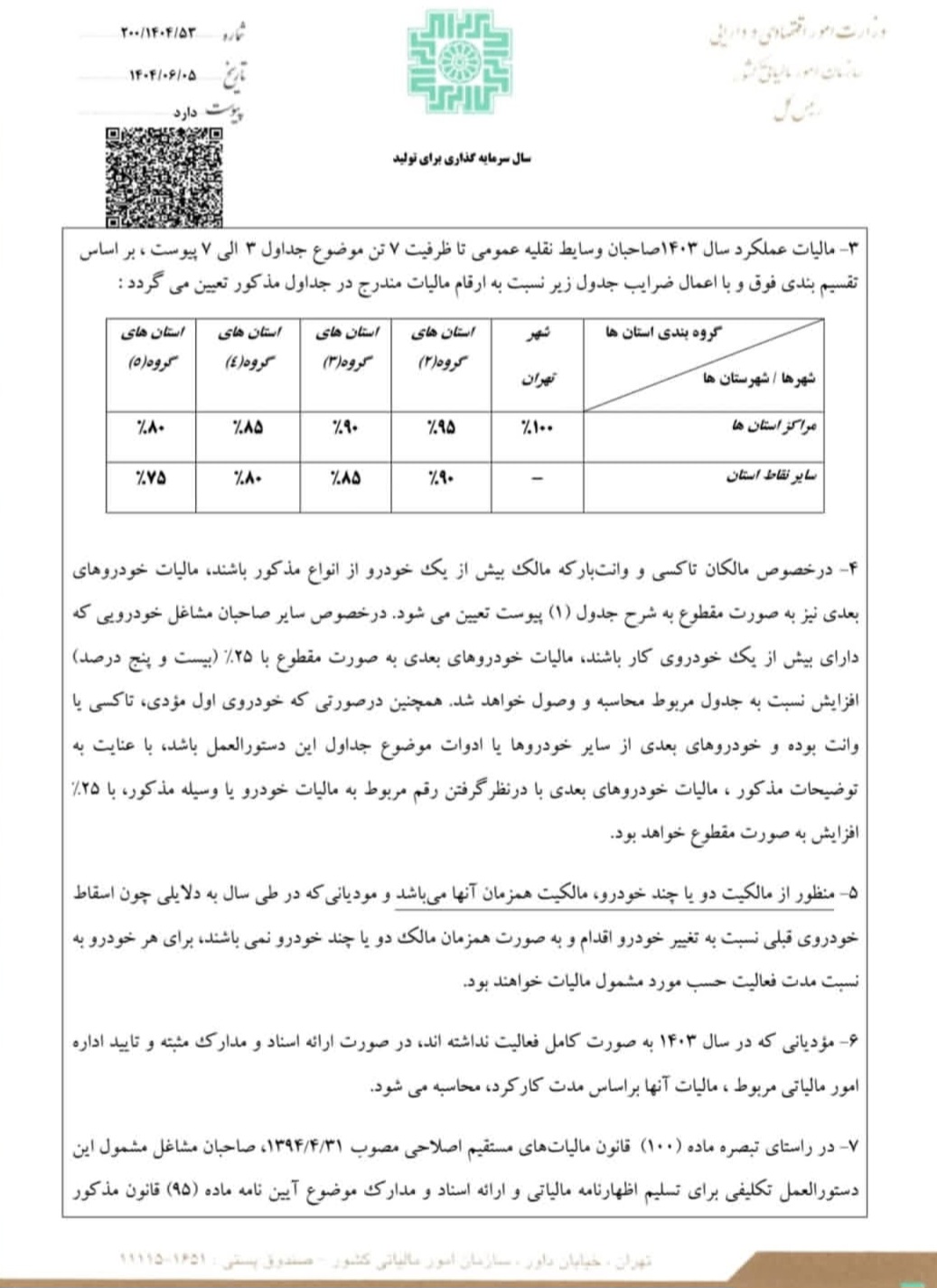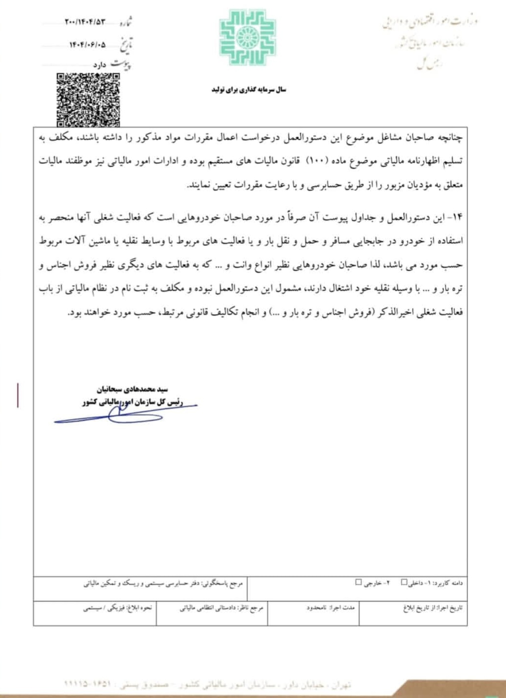 دستورالعمل تعیین مالیات مقطوع عملکرد سال 1403 صاحبان مشاغل خودرویی در اجرای تبصره ماده 100 قانون مالیاتهای مستقیم مصوب 1394/04/31