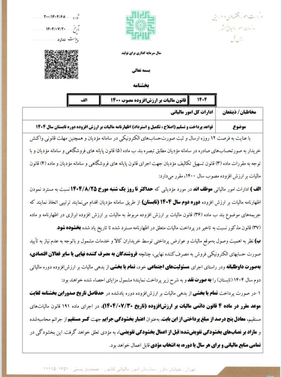 بخشنامه تمدید ِ (اصلاح، تکمیل، استرداد، پرداخت) اظهارنامه ارزش افزوده تابستان 1404