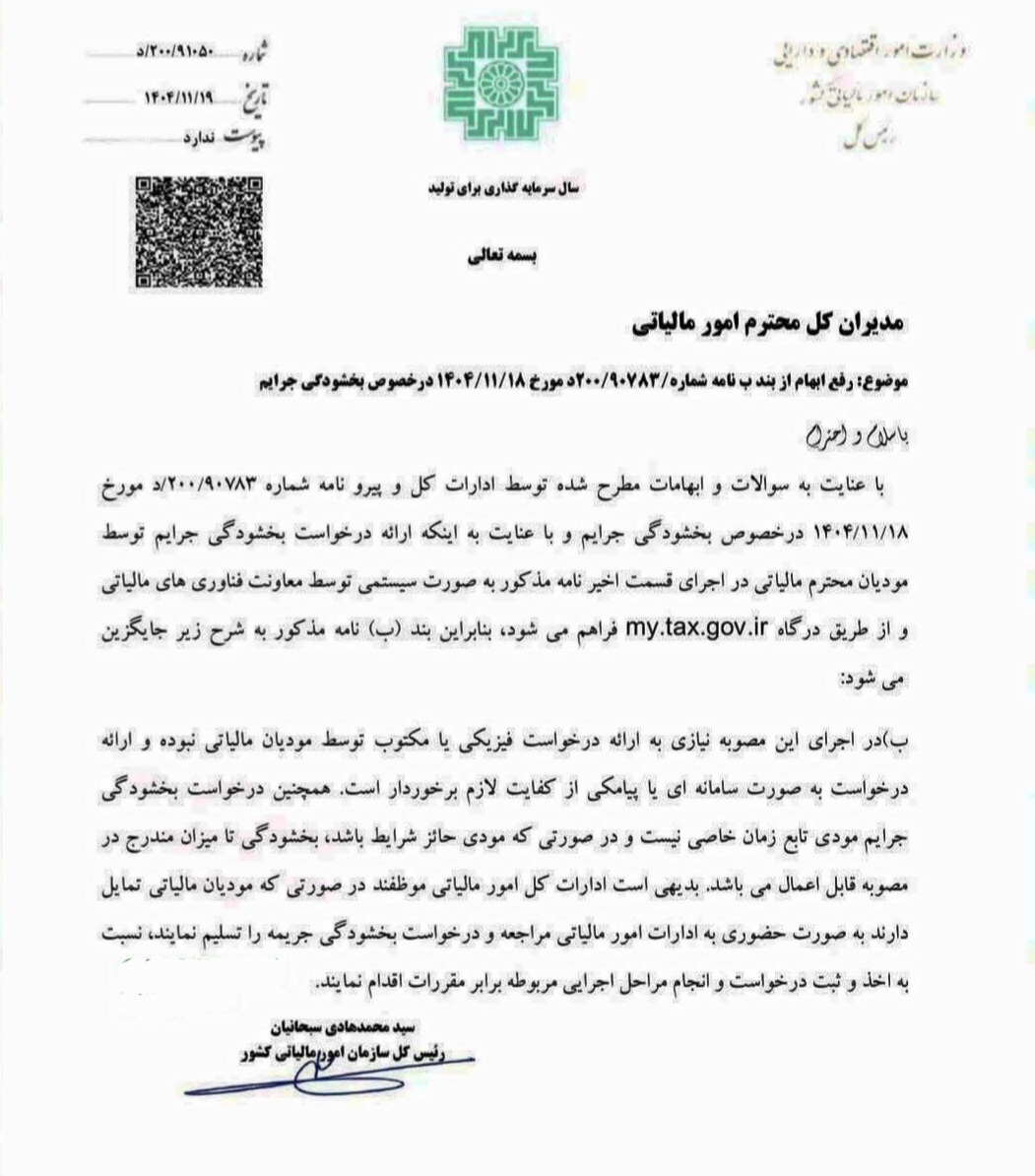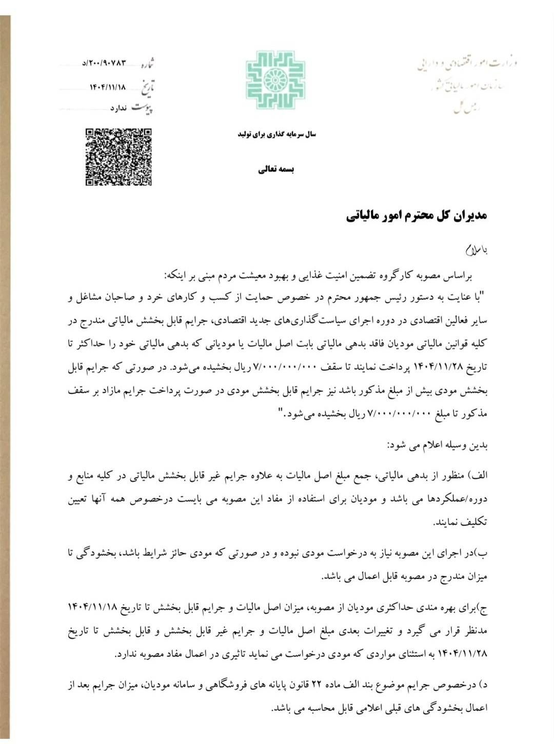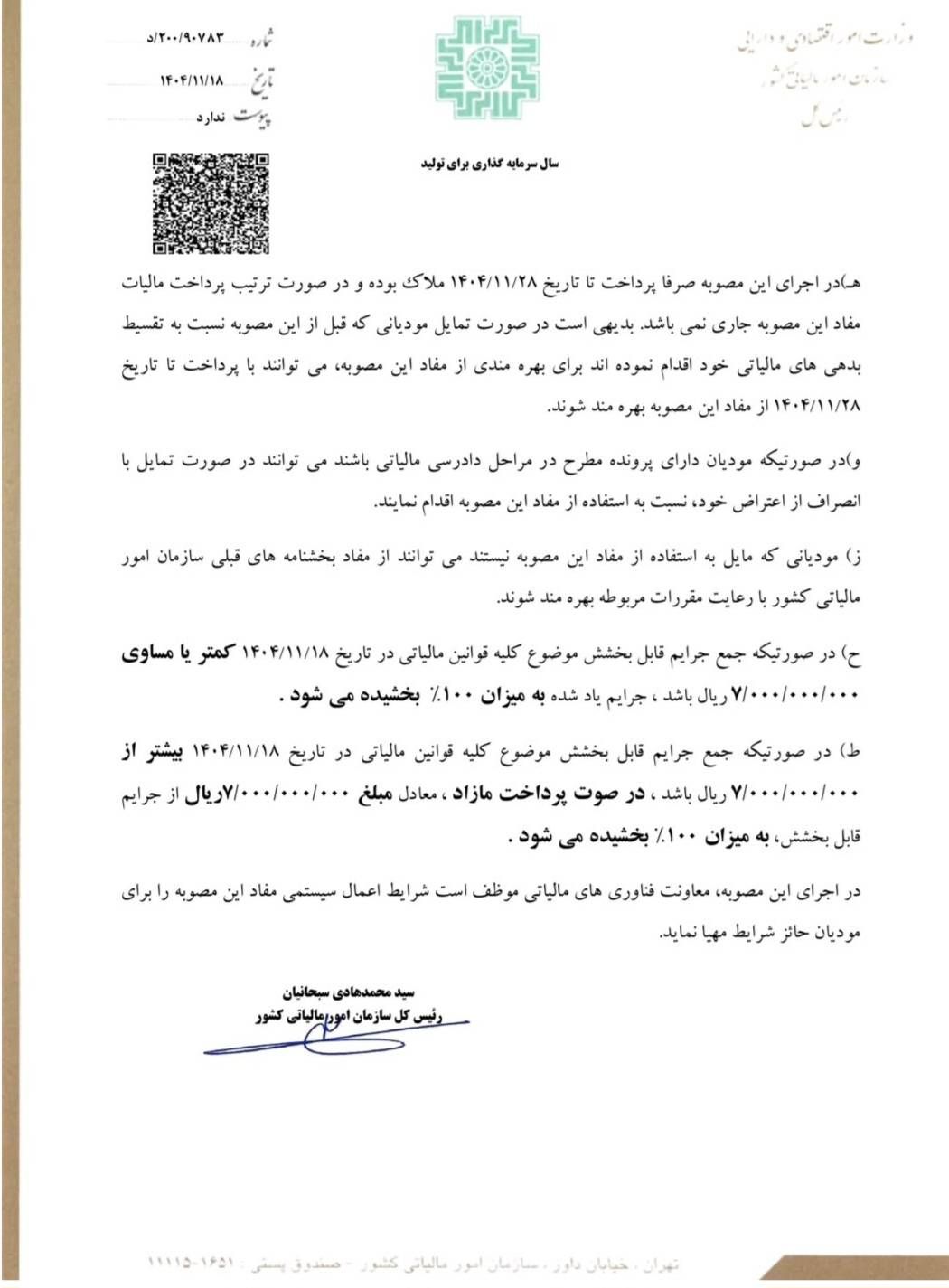 بخشودگی جرایم مالیاتی به شماره ۹۰۷۸۳/ ۲۰۰/د به تاریخ ۱۴۰۴/۱۱/۱۸ + نامه رفع ابهام آن به شماره ۹۱۰۵۰/ ۲۰۰/د به تاریخ ۱۴۰۴/۱۱/۱۹ + نامه تمدید تا 14 اسفند 1404 به شماره 93750/ 200/د به تاریخ 1404/11/28
